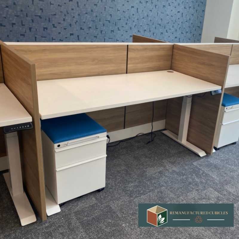 Remanufactured Knoll cubicles with walnut laminate panels and sit-to-stand desks